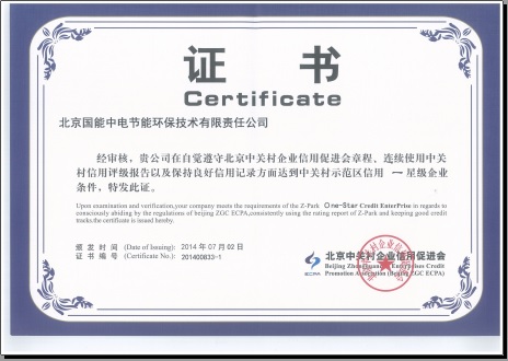 2014年7月2日,我公司榮獲”中關(guān)村示范區(qū)信用一星級企業(yè)證書”。該證書證明我公司在信用度方面贏得中關(guān)村管委會及中國人民銀行的認(rèn)可,企業(yè)融資能力不斷攀升。
