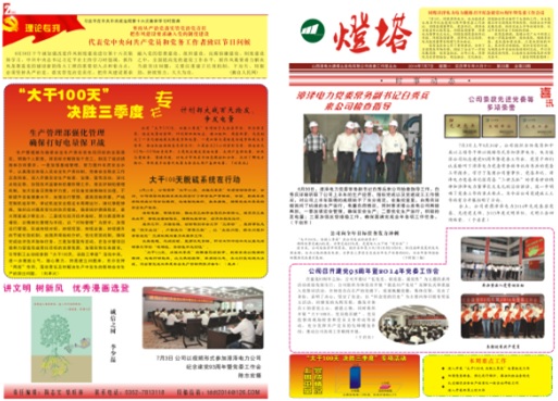 2014年6月26日,國能中電塔山維護(hù)項目部參加山西漳電大唐塔山發(fā)電公司召開的“大干100天、決勝三季度”專項活動動員會,并與業(yè)主簽訂了安全生產(chǎn)責(zé)任狀。項目部為此制定了各項組織、技術(shù)、安全措施。同時,項目部專題稿件“大干100天,脫硫在行動”榮登于塔山發(fā)電公司《塔山燈塔報》第23期一、二版。