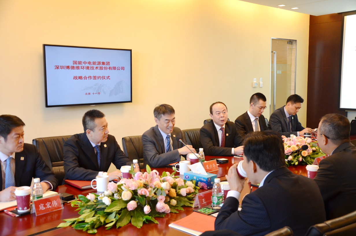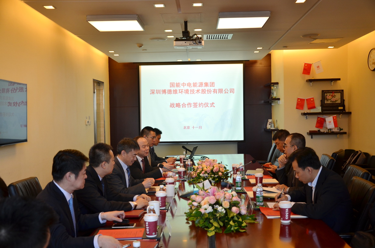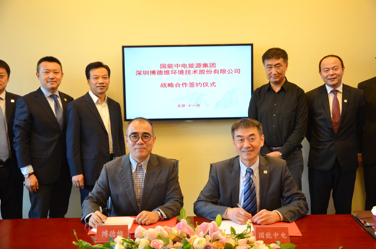 2017年11月8日上午,國能中電能源集團有限責任公司與深圳博德維環(huán)境技術(shù)股份有限公司達成戰(zhàn)略合作協(xié)議,并在國能中電集團總部舉行了簽約儀式。博德維總裁蕭龍、技術(shù)副總裁王秦、北京公司總經(jīng)理崔艷軍,國能中電集團副董事長裴少華,國能中電集團董事、北京國能中電節(jié)能環(huán)保技術(shù)股份有限公司總裁初煒,國能中電集團副總裁、國峰清源生物能源有限責任公司總經(jīng)理楊靜、北京國能中電節(jié)能環(huán)保技術(shù)股份有限公司副總裁寇宏偉,國能中電(北京)投資有限責任公司總經(jīng)理王邁,國能中電能源集團廣東分公司常務(wù)副總經(jīng)理張翼,北京國能中電節(jié)能環(huán)保技術(shù)股份有限公司設(shè)計院副院長黃準等領(lǐng)導(dǎo)出席了簽約儀式。
